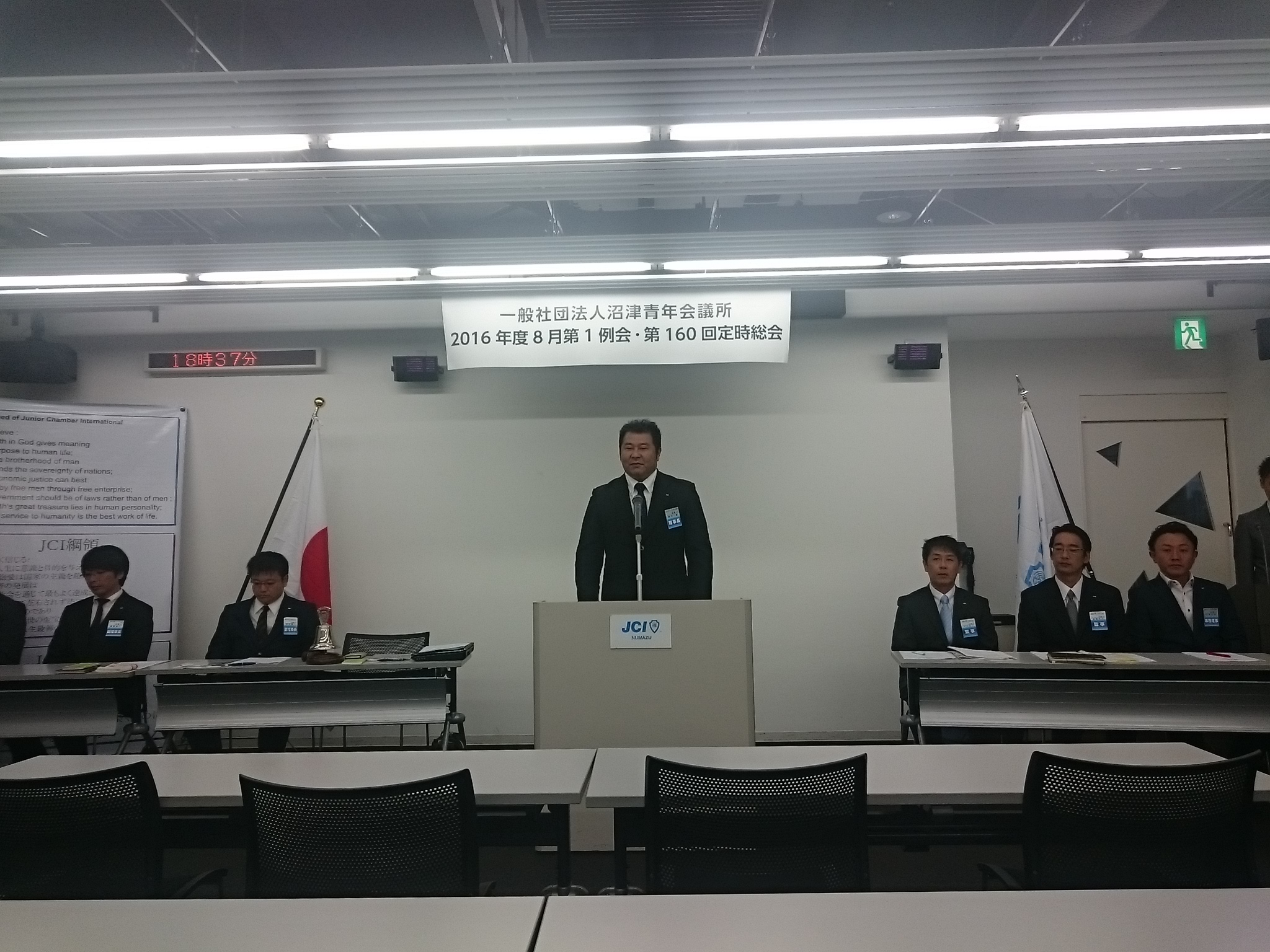 8月8日(月)に8月第1例会 第160回定時総会がサンウェル沼津にて開催されました。当日は2017年度理事長予定者・理事予定者選定の可決が執り行われました。次年度理事長予定者であります、原田健一君より心強い意気込みを聞くことできました。