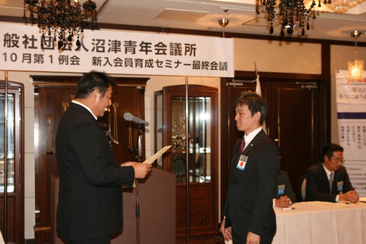 また入会承認証授与式では沼津JCから鈴木宏和君、佐々木綱柄君、細溝剛久君の新入会員の授与式を髙橋ブロック会長に行っていただきました。