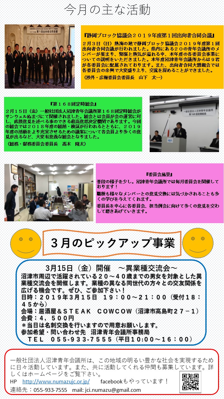 今年度、一般社団法人沼津青年会議所では、各月の活動を広報紙として配信いたします!第1号の今回は第65代山本理事長のあいさつと、1月の活動内容が掲載されております。是非ご覧下さい。