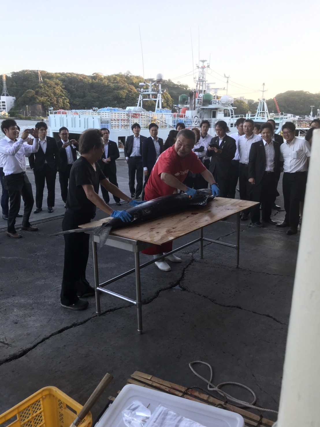 その後下田市魚市場で行われた、祝賀会では、下田自慢の海産物が振る舞われアトラクションとして開催されたマグロの解体ショーには歓声が沸き起こりました。